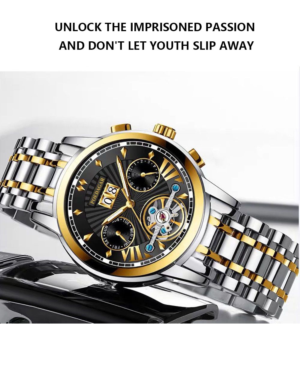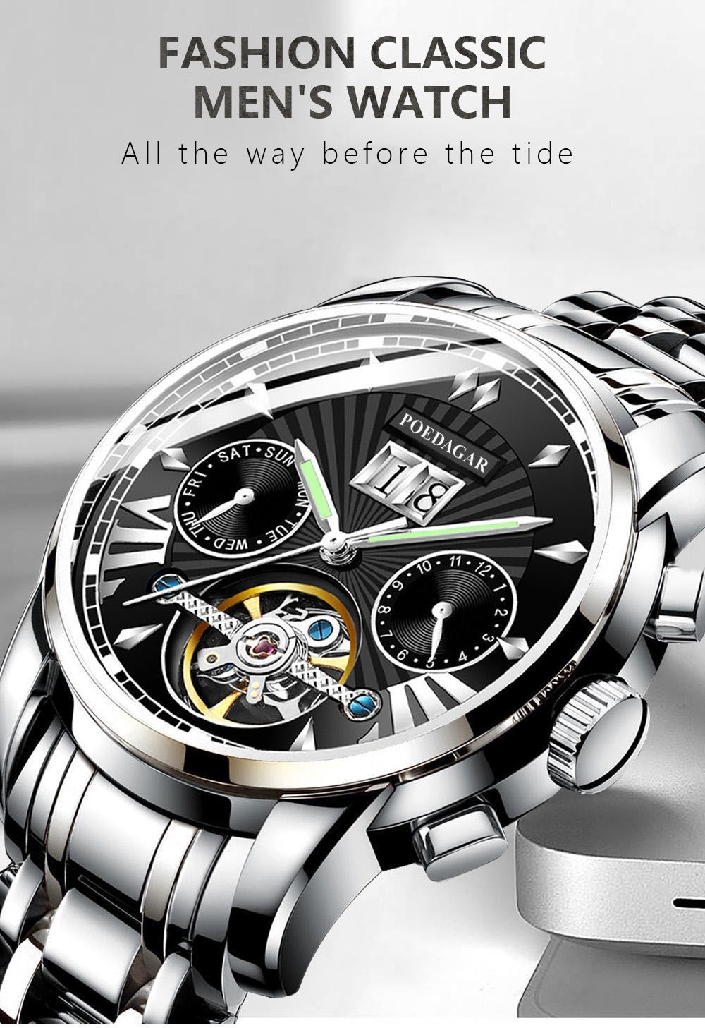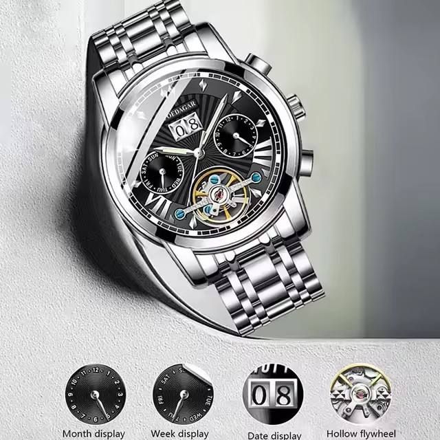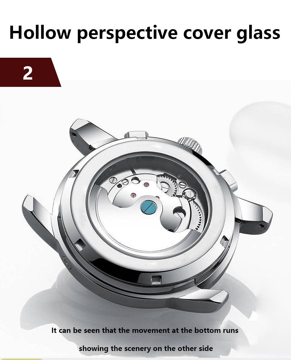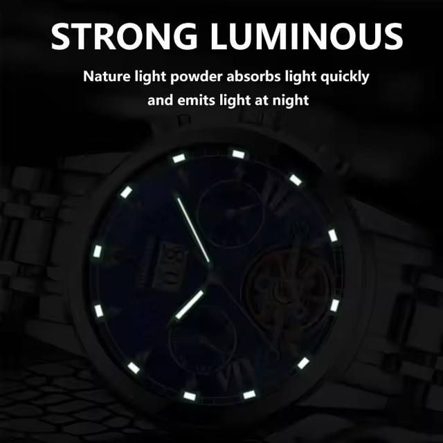Men's automatic mechanical watch with skeletonized dial and luminous hands.