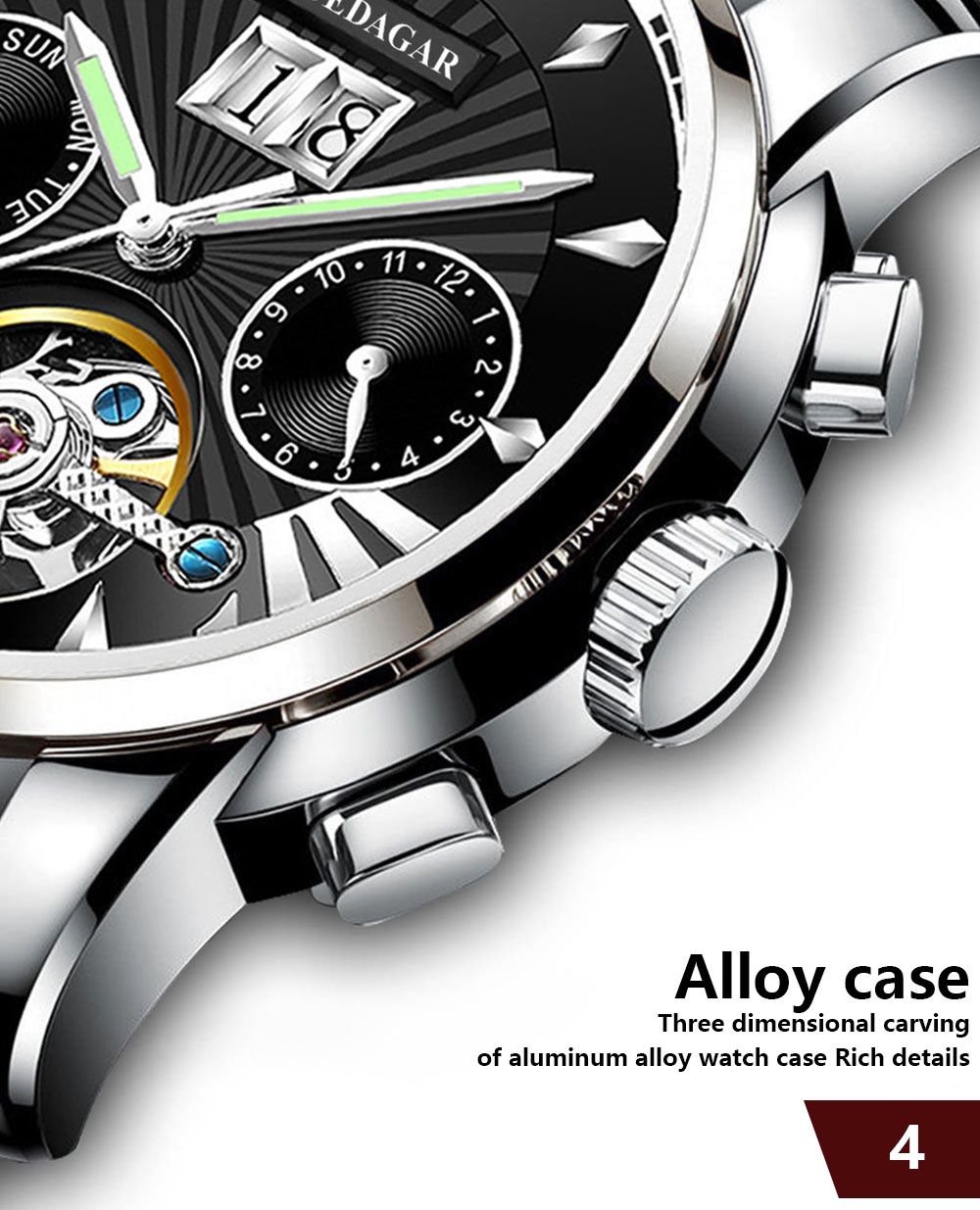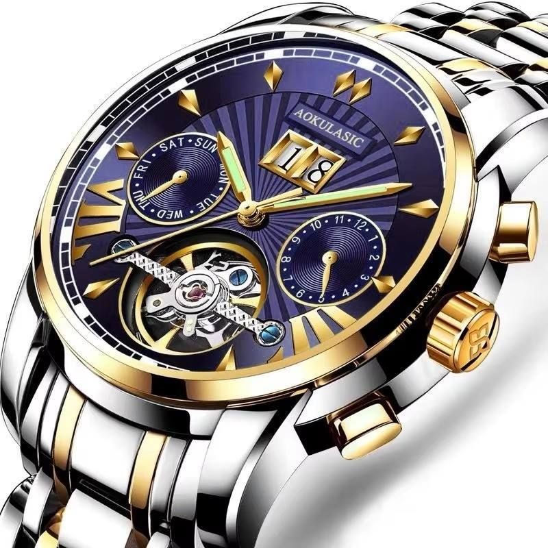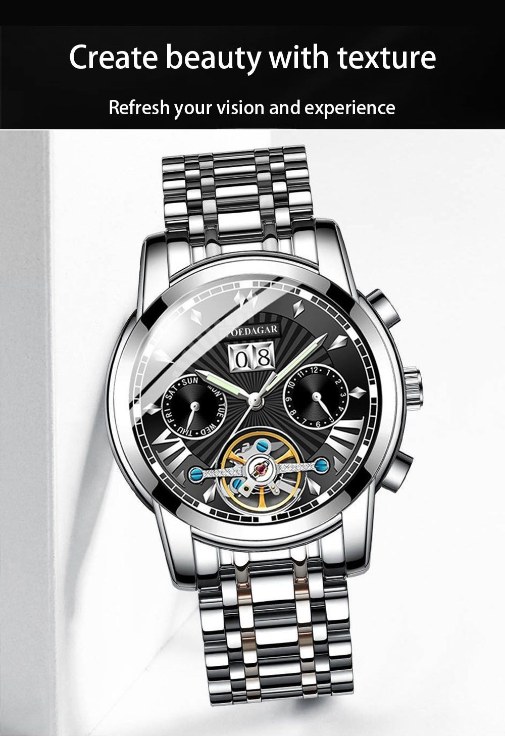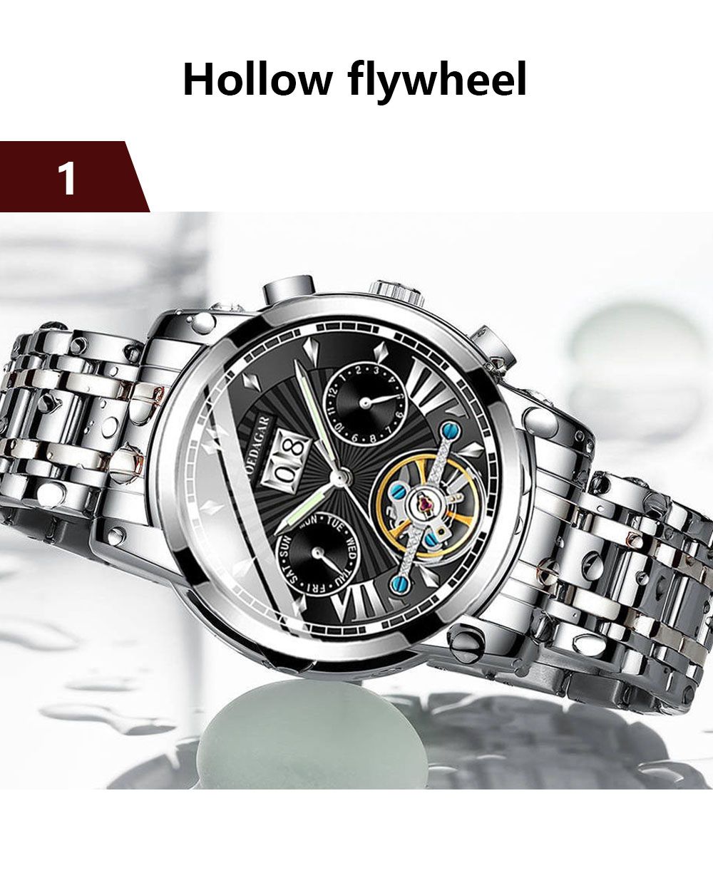 Men's automatic mechanical watch with skeletonized dial and luminous hands.