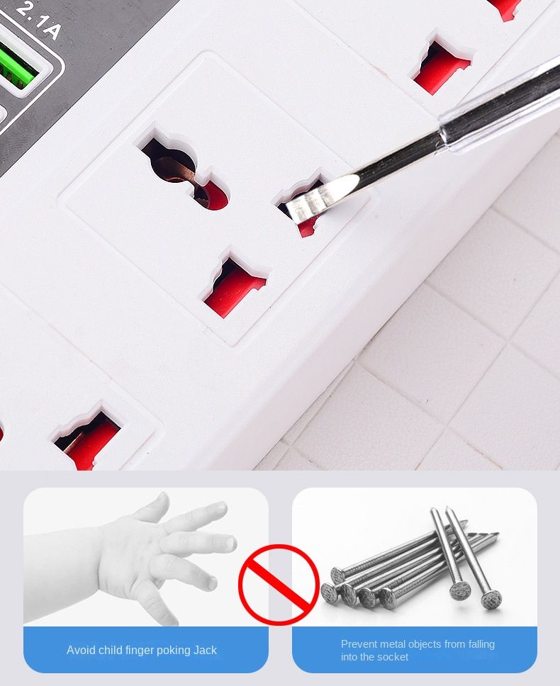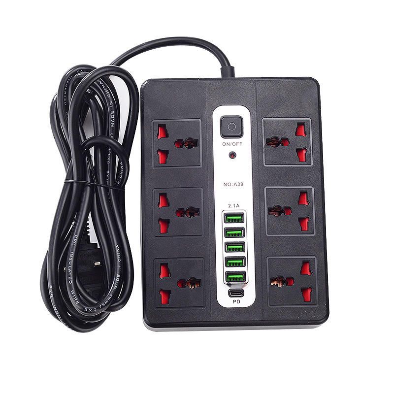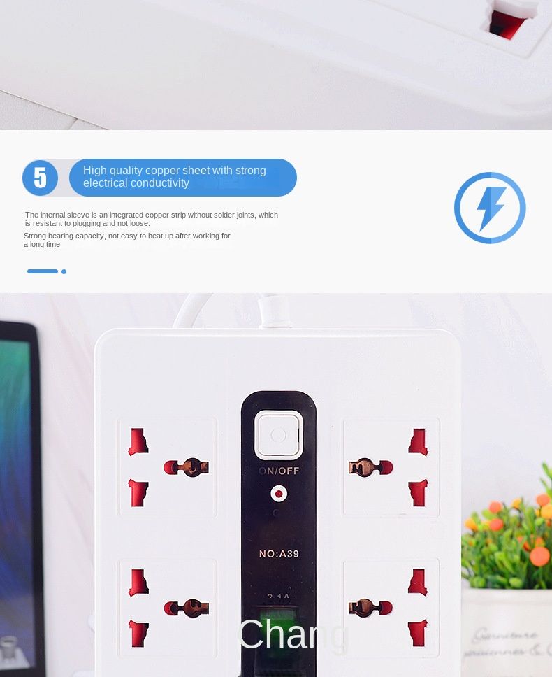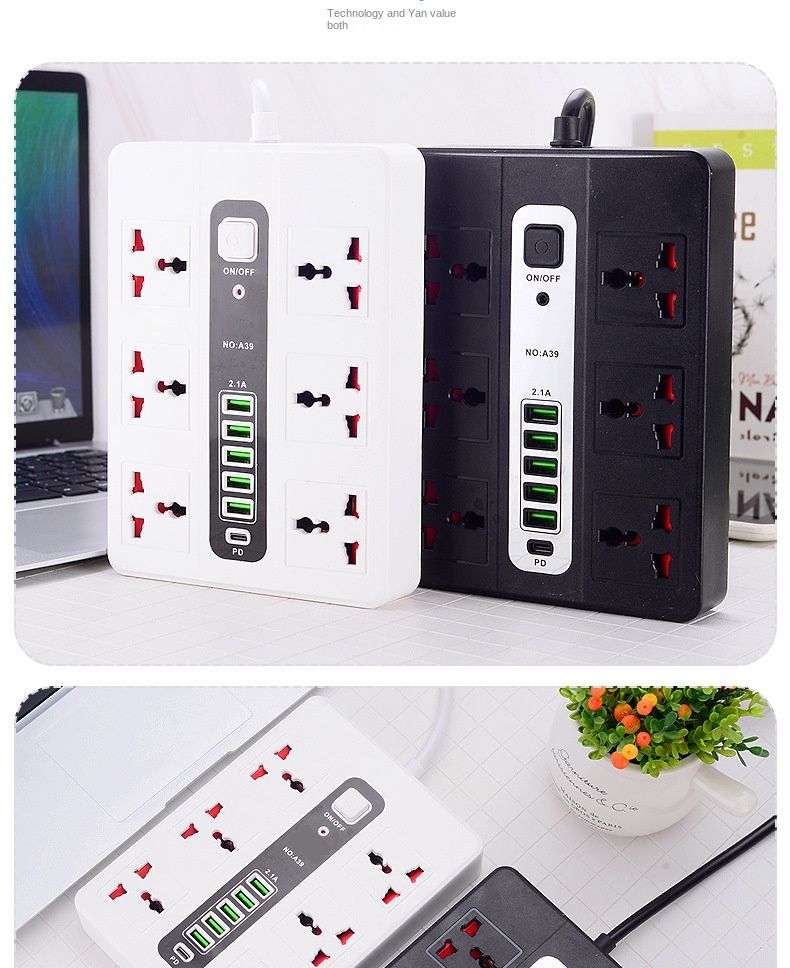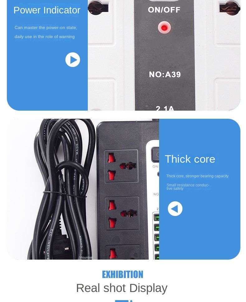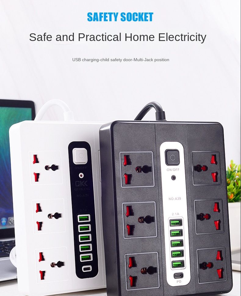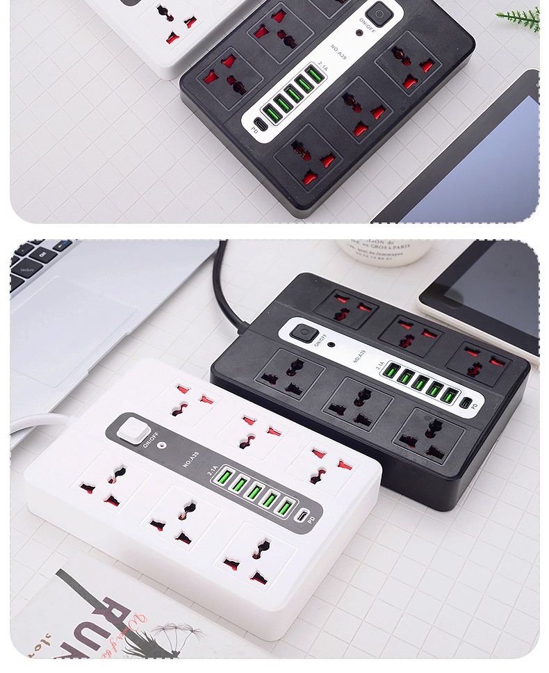 Multi-functional standard USB power strip extension cord with 6 AC outlets, 5 USB ports, 10A rating, 2m cable, and copper plugs and sockets.