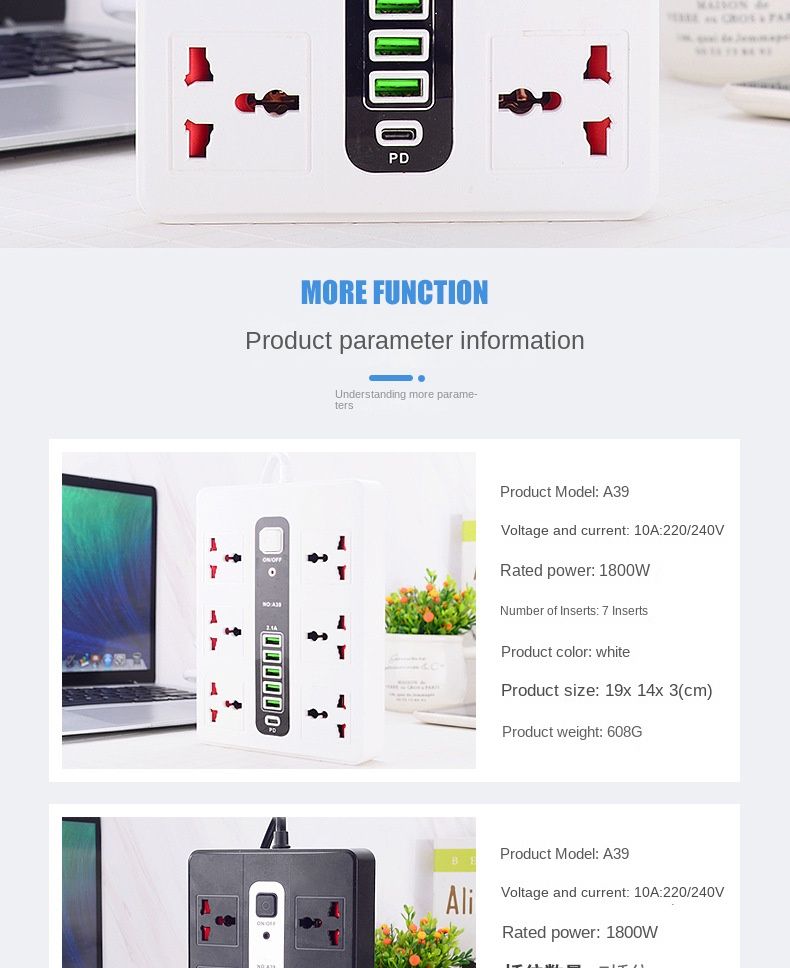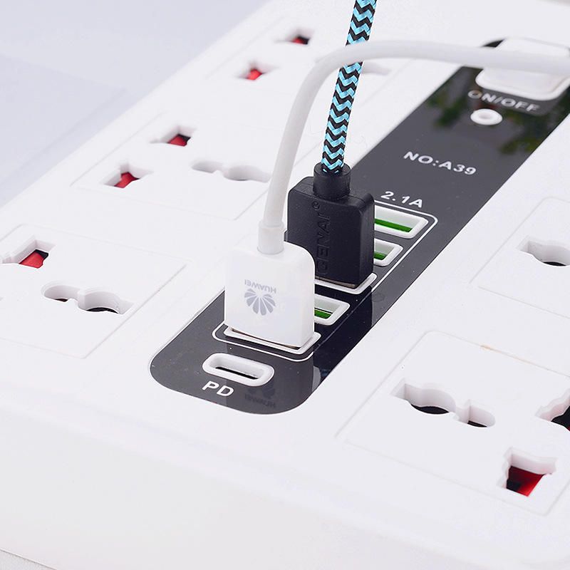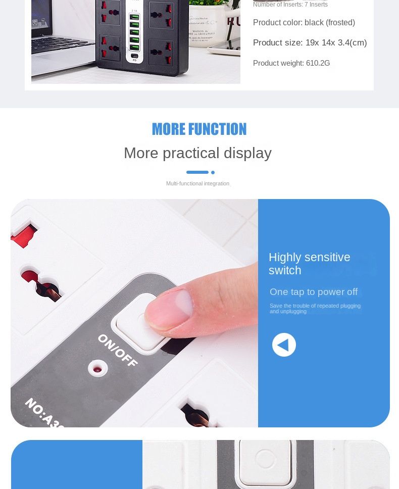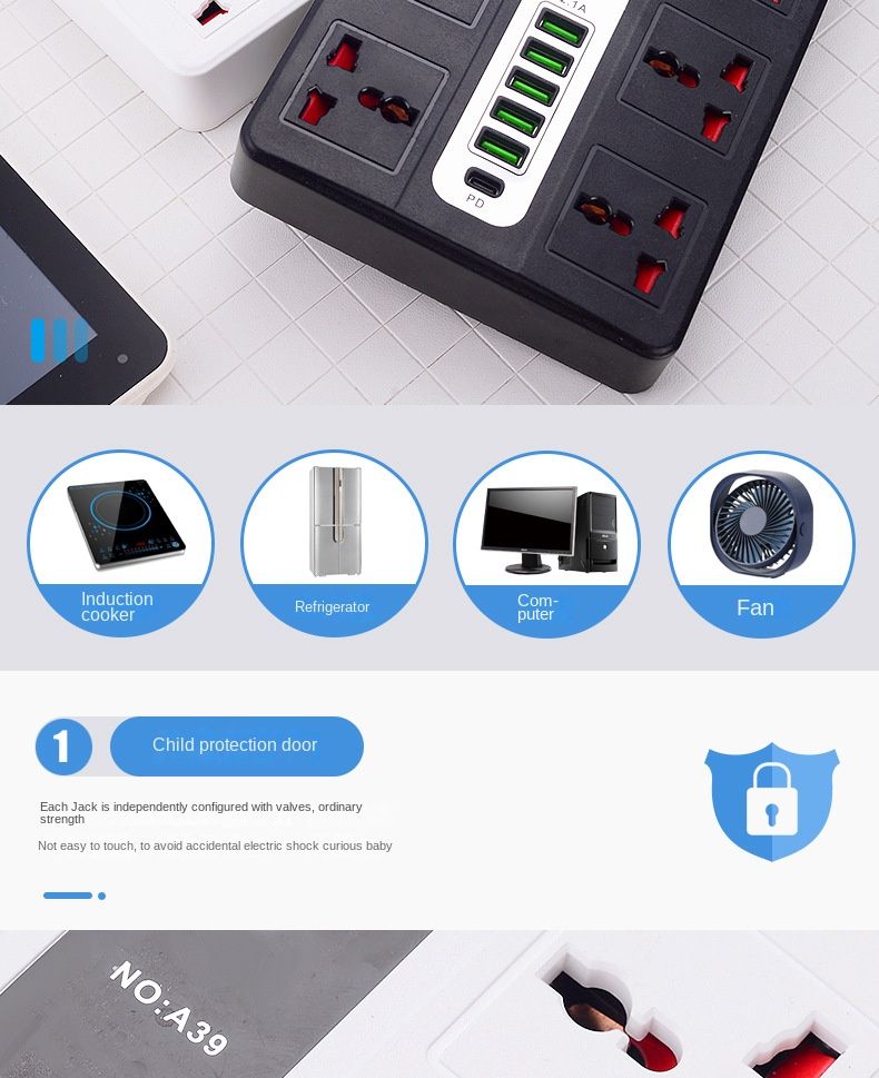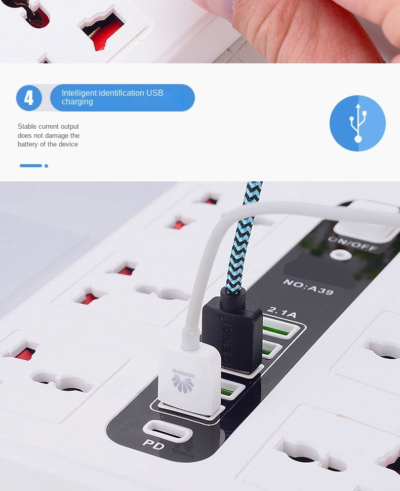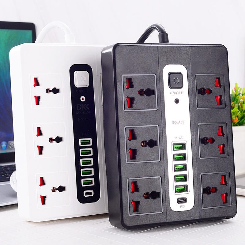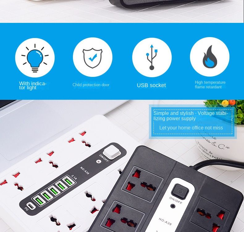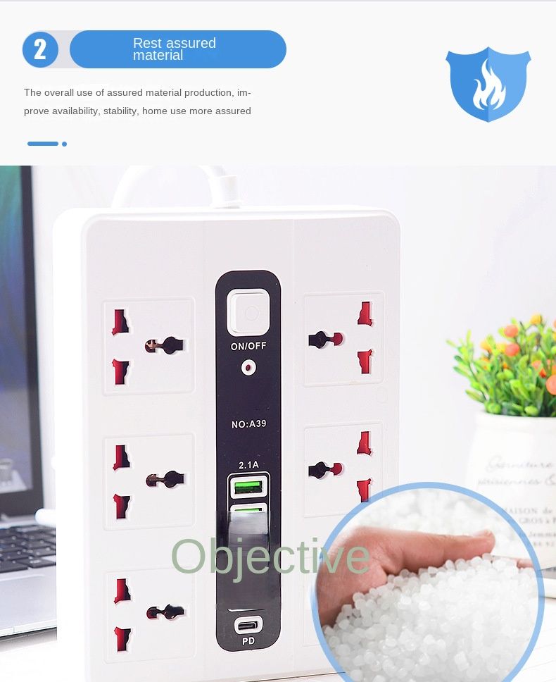 Multi-functional standard USB power strip extension cord with 6 AC outlets, 5 USB ports, 10A rating, 2m cable, and copper plugs and sockets.