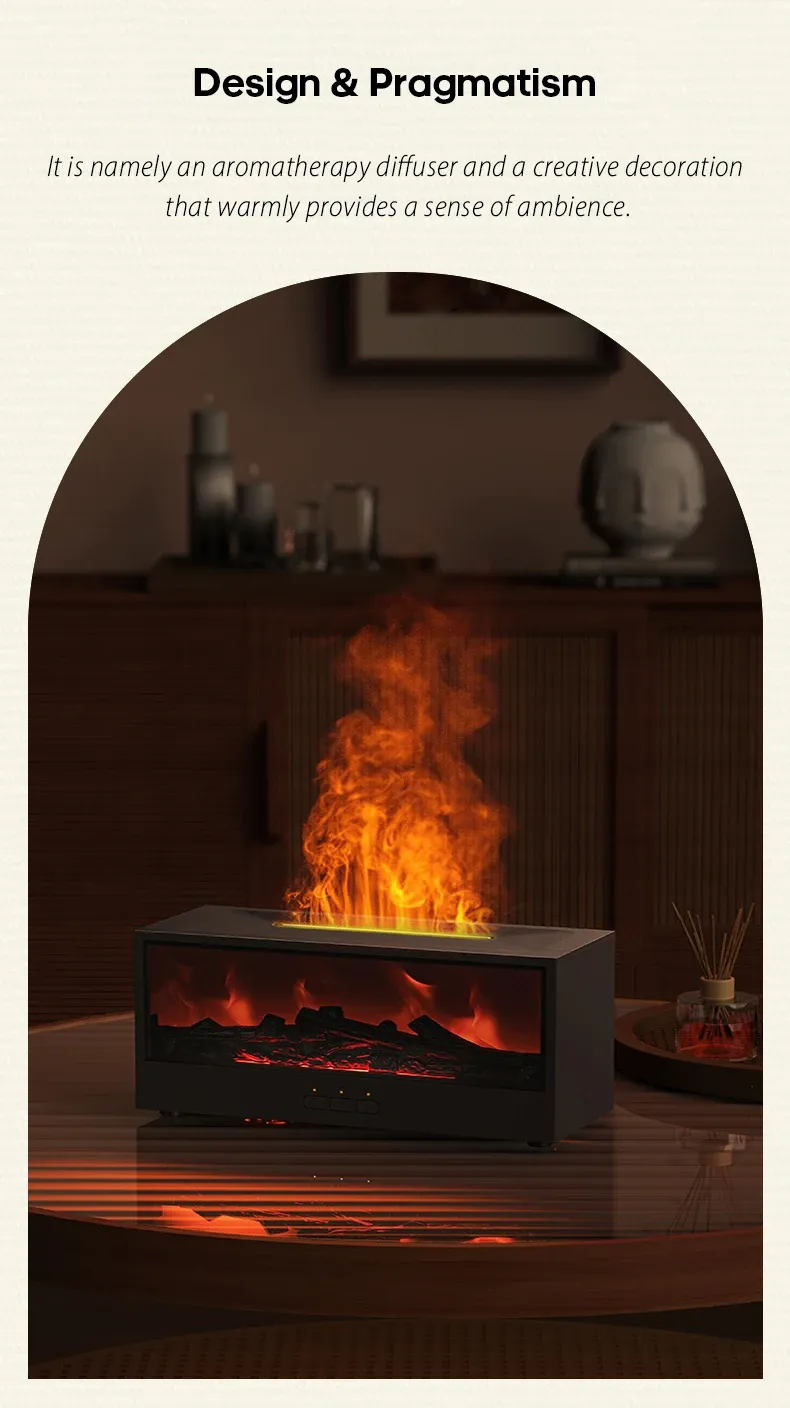 New retro fireplace flame humidifier with 3D simulated fireplace flame diffuser, featuring colored home desktop ambient lighting.