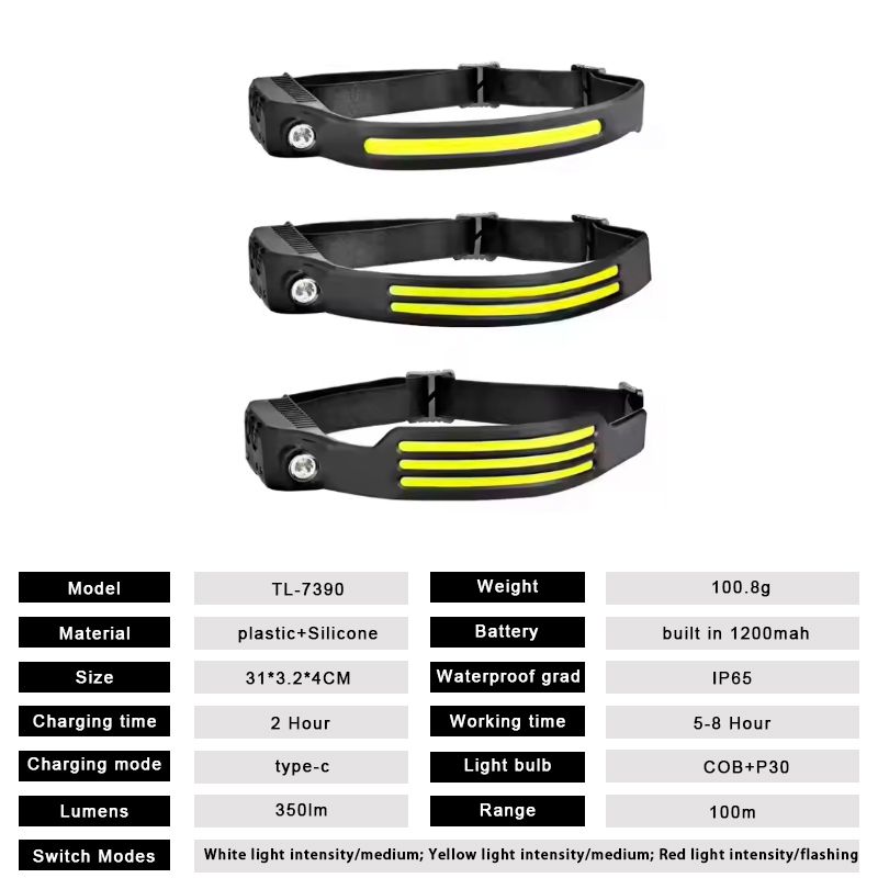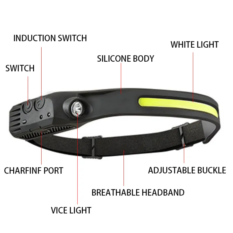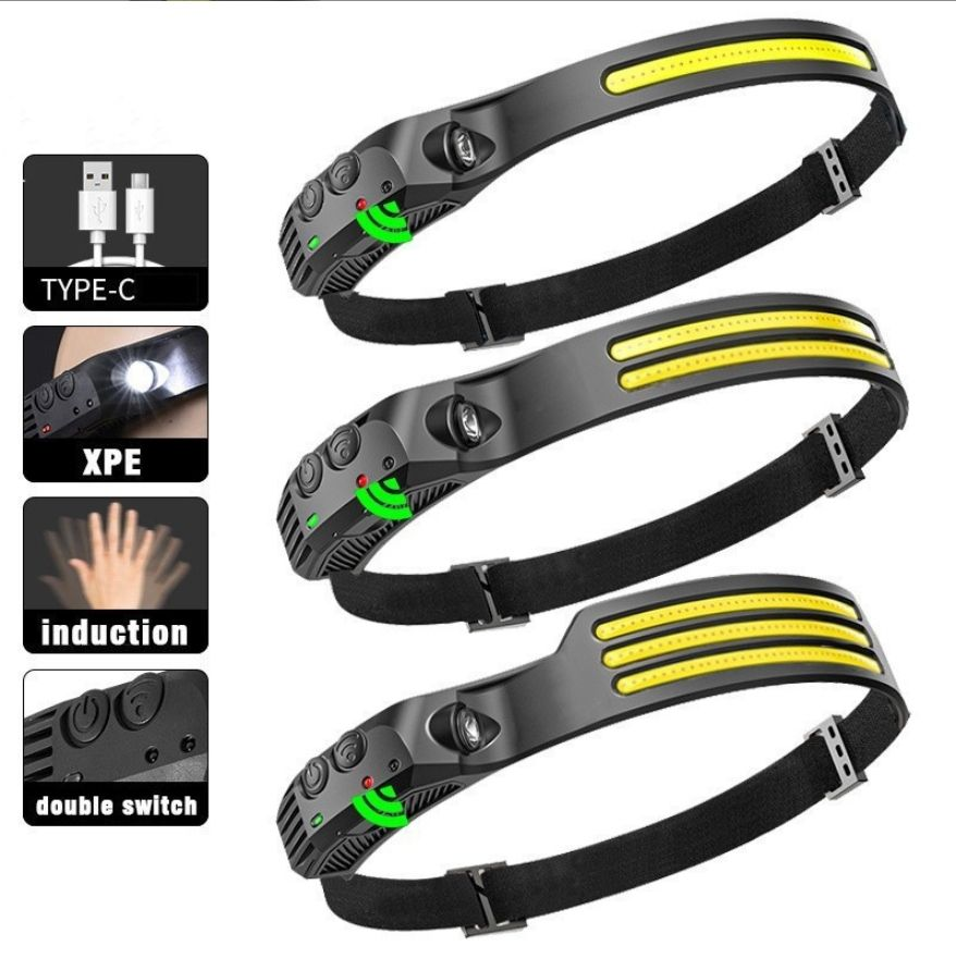 Portable rechargeable headlamp with XPE and COB LEDs for outdoor climbing and work.
