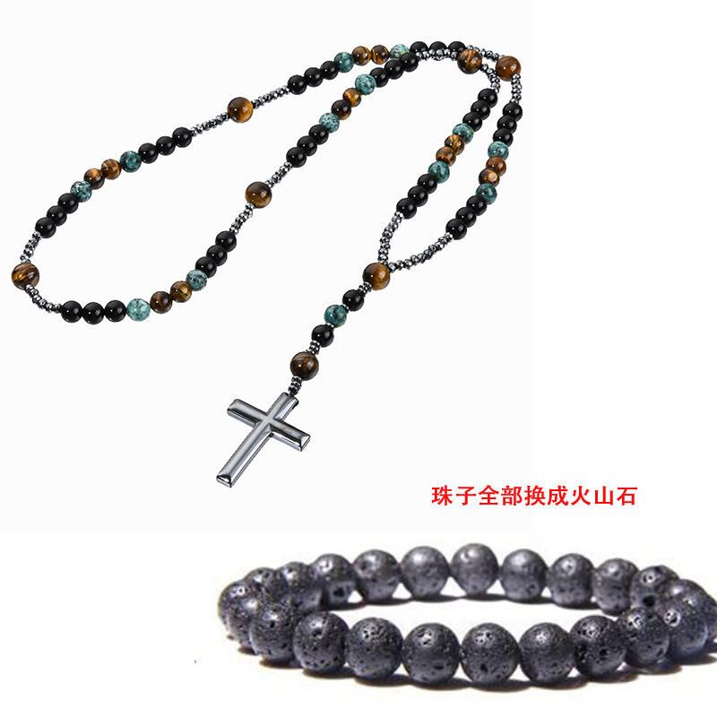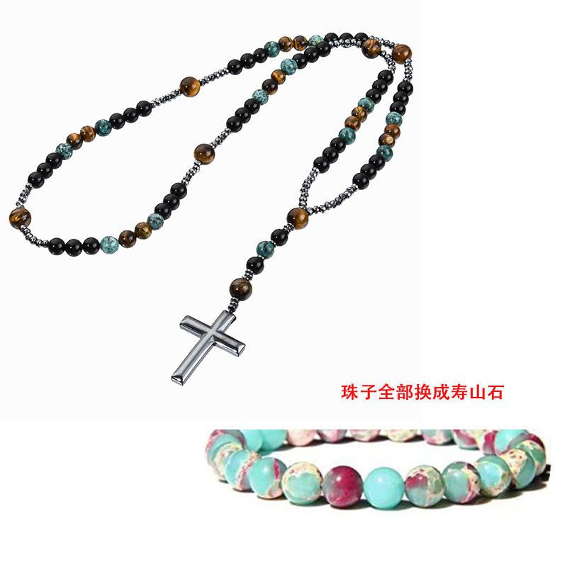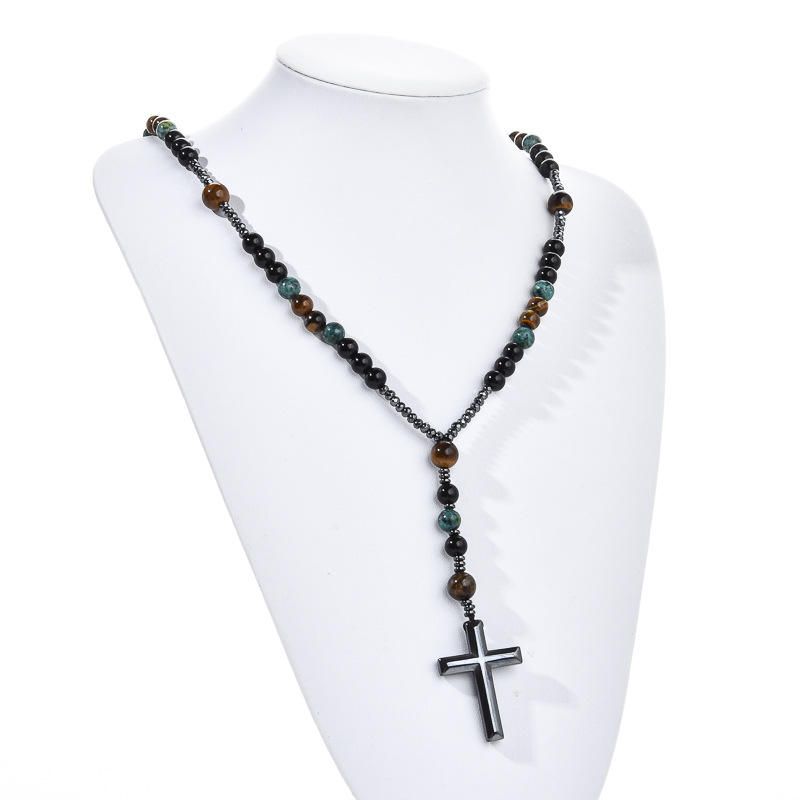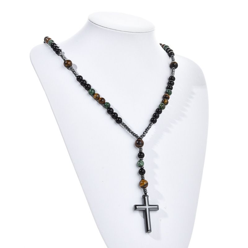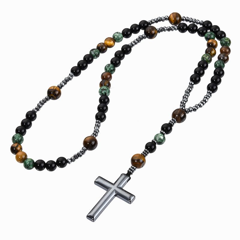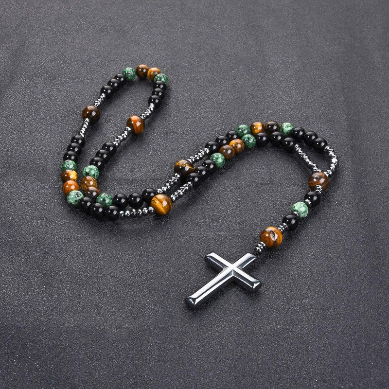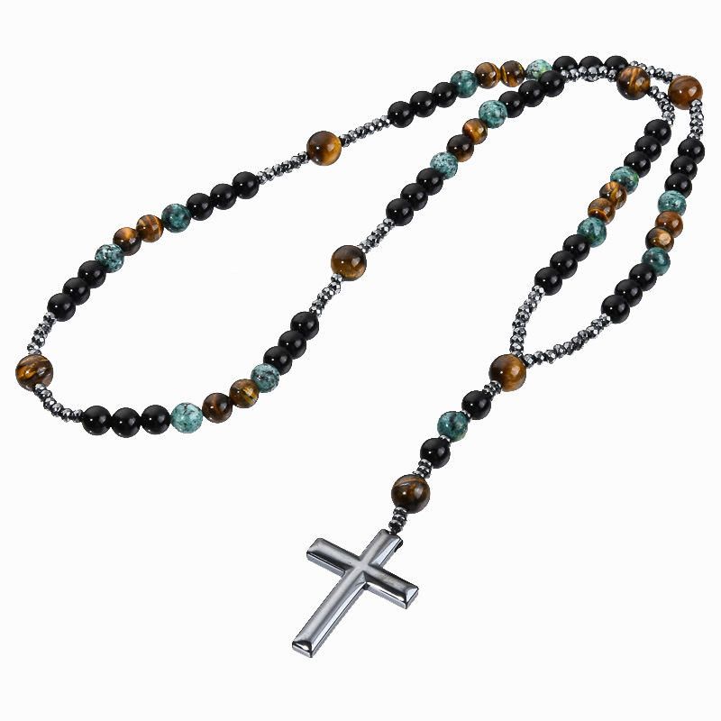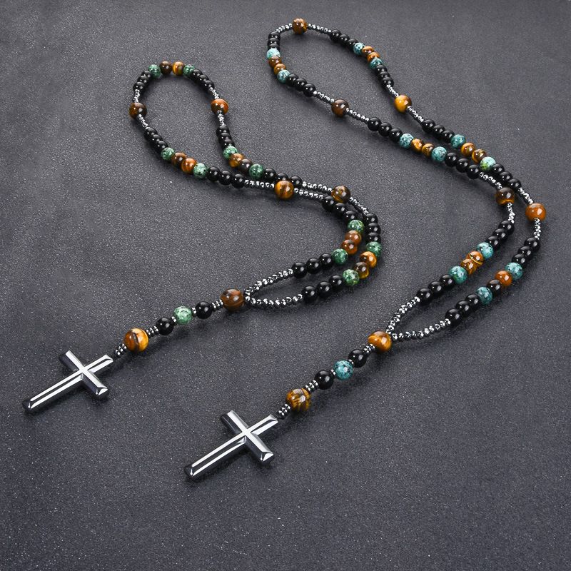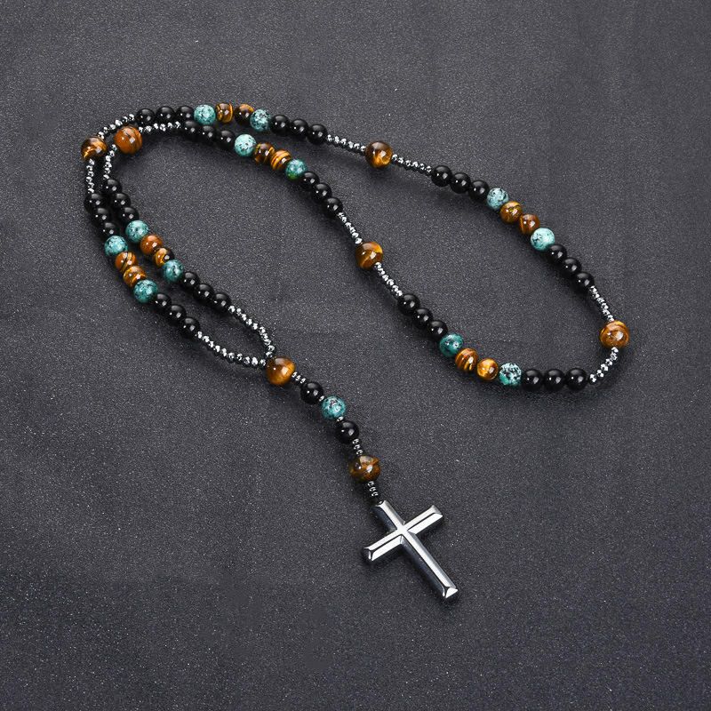 Turquoise, black agate, yellow tiger's eye, Catholic rosary, cross pendant necklace