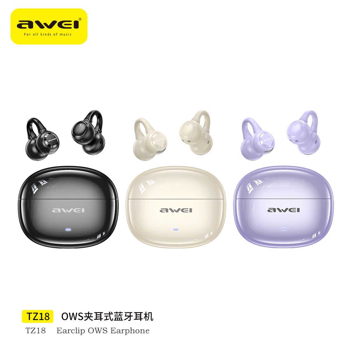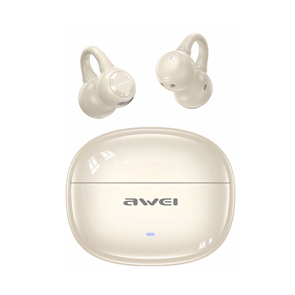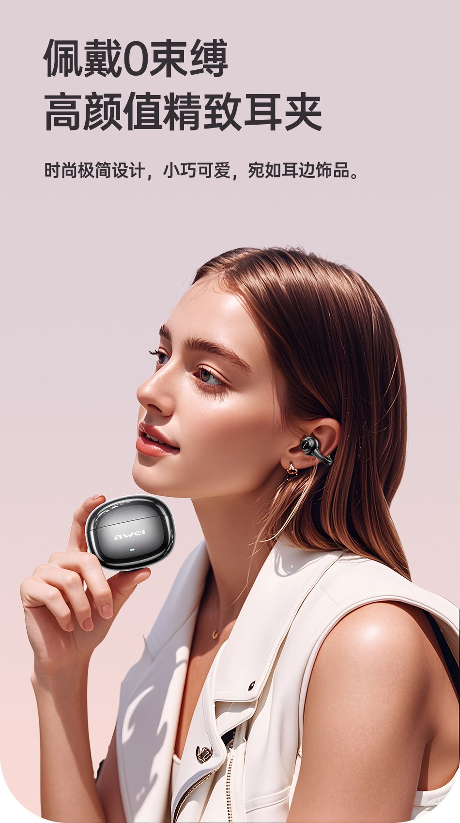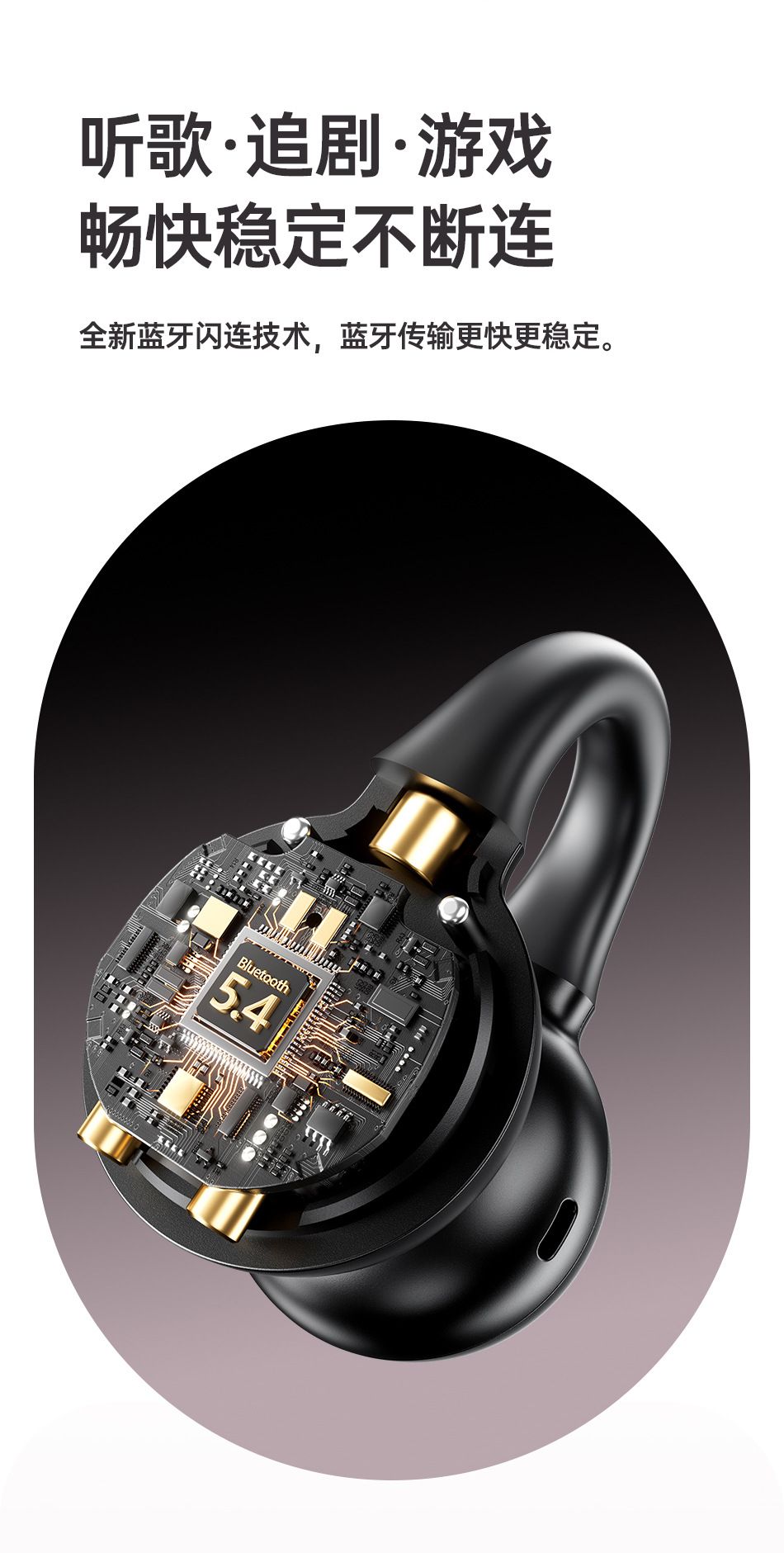 Bluetooth wireless earphones, comfortable for extended wear, with dual deep bass and clip-on design.