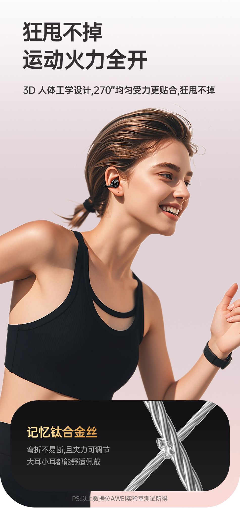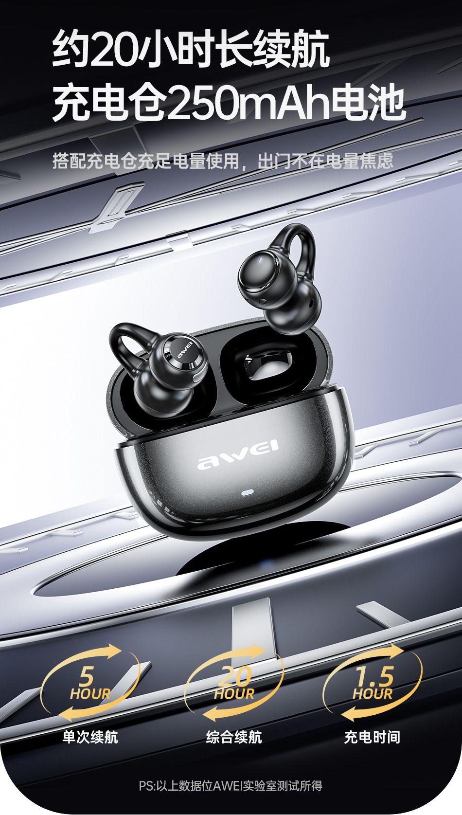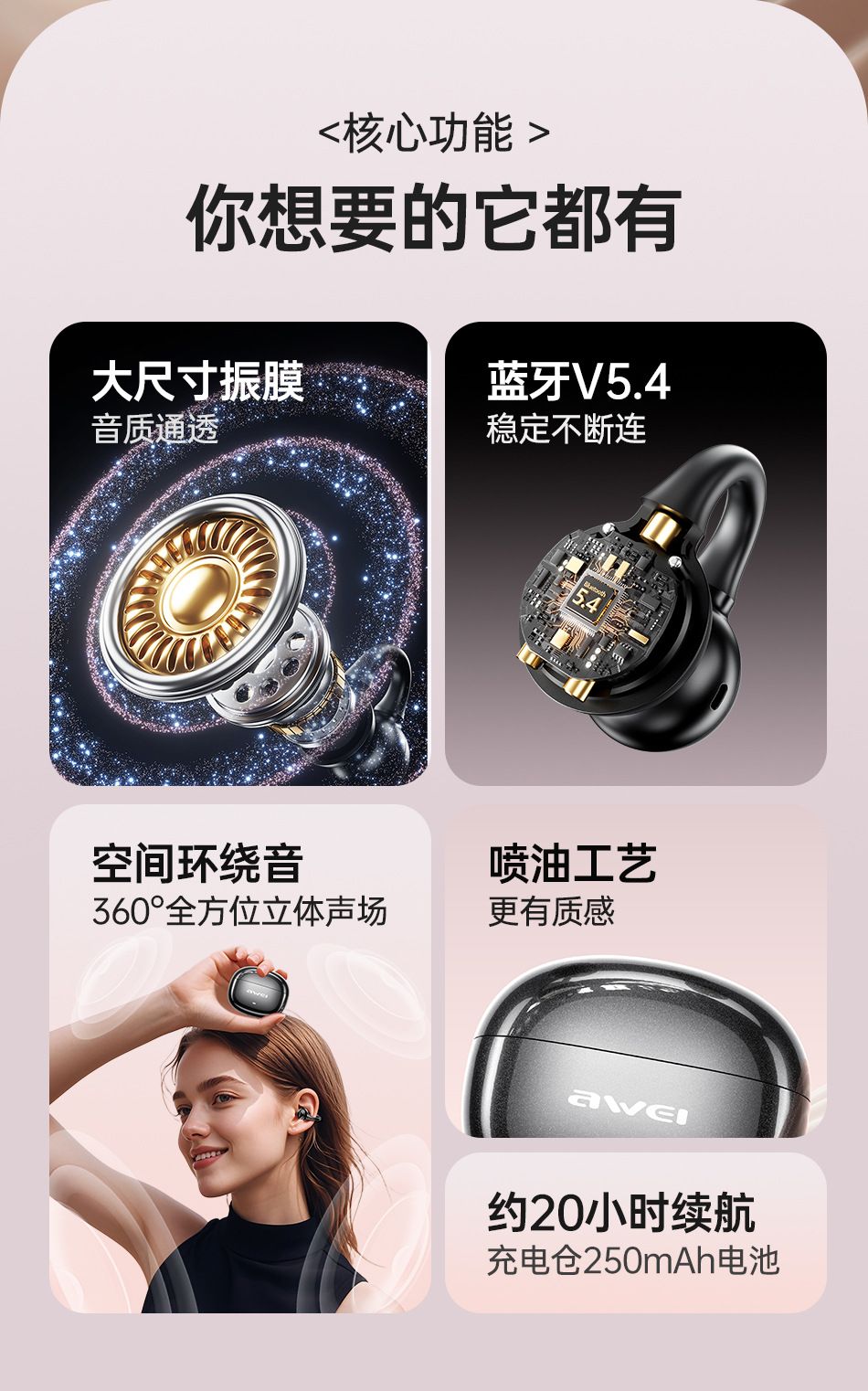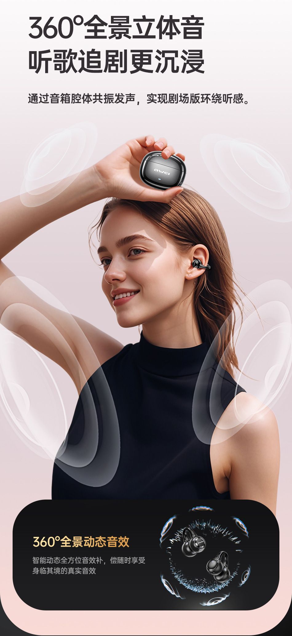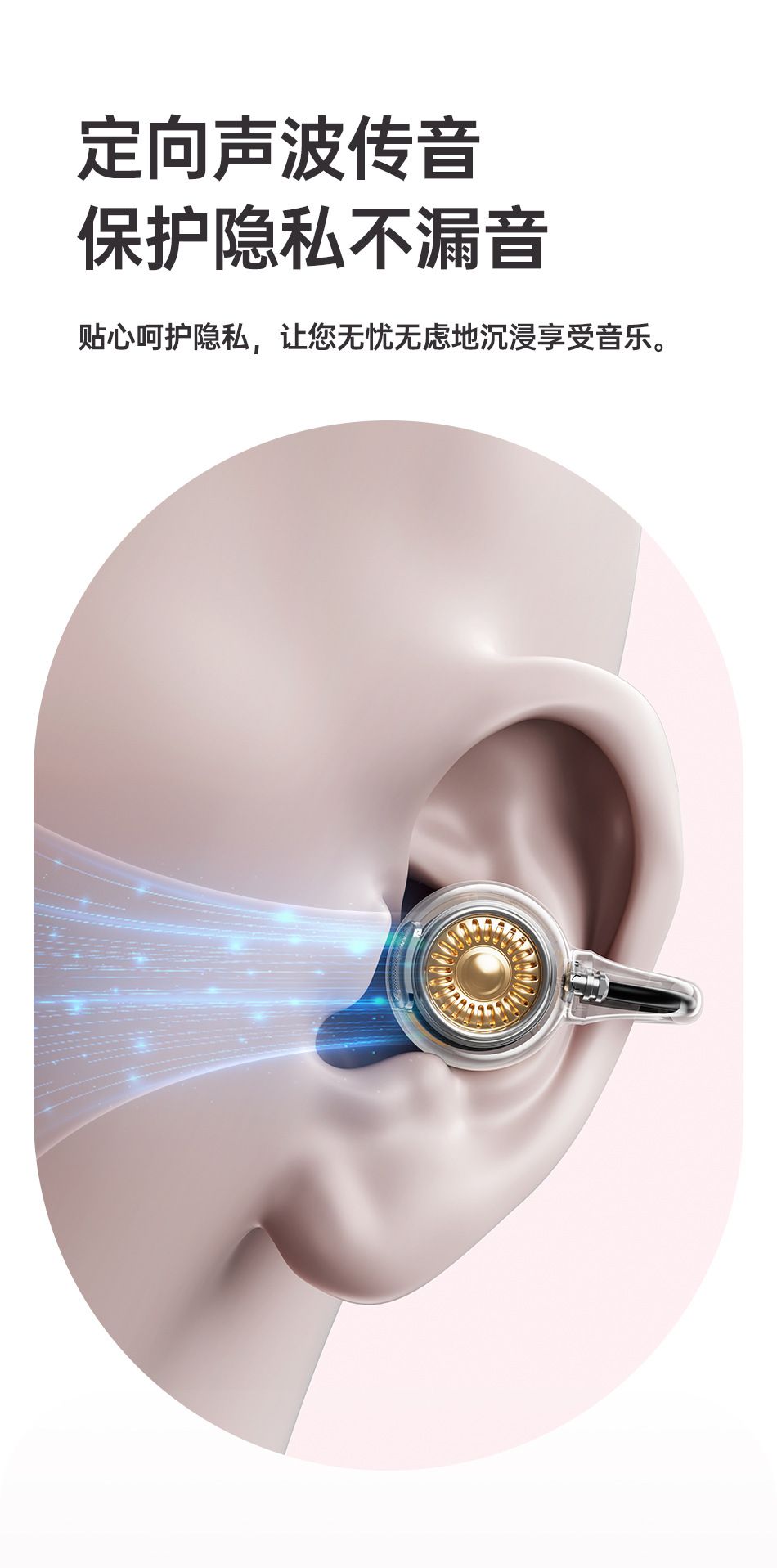 Bluetooth wireless earphones, comfortable for extended wear, with dual deep bass and clip-on design.